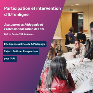 Intelligence Artificielle : Quels outils pour quelles pratiques pédagogiques ? Du 5 au 7 mai 2025, IUTenligne a participé aux Journées Pédagogie et Professionnalisation (JPP) organisées à l’IUT de Nan...